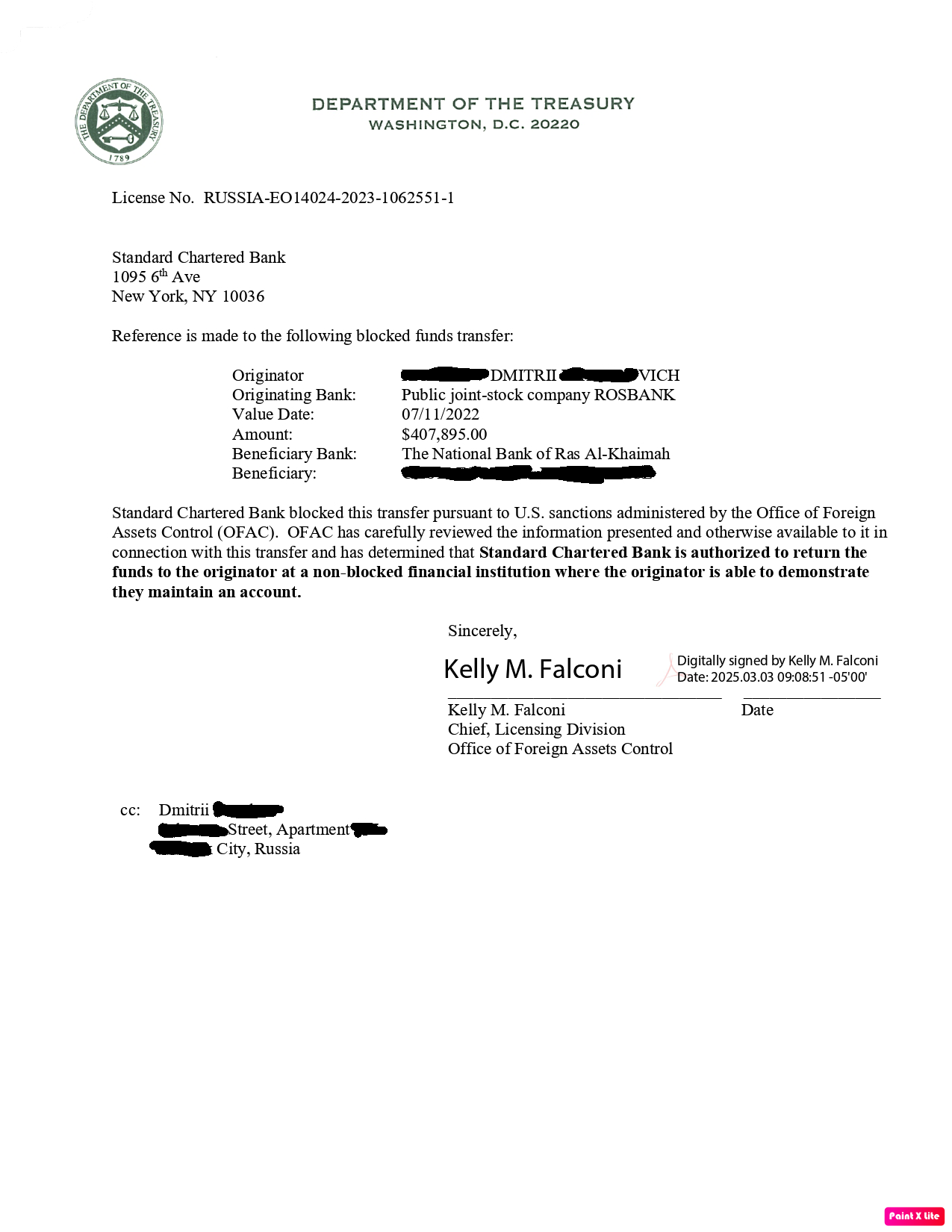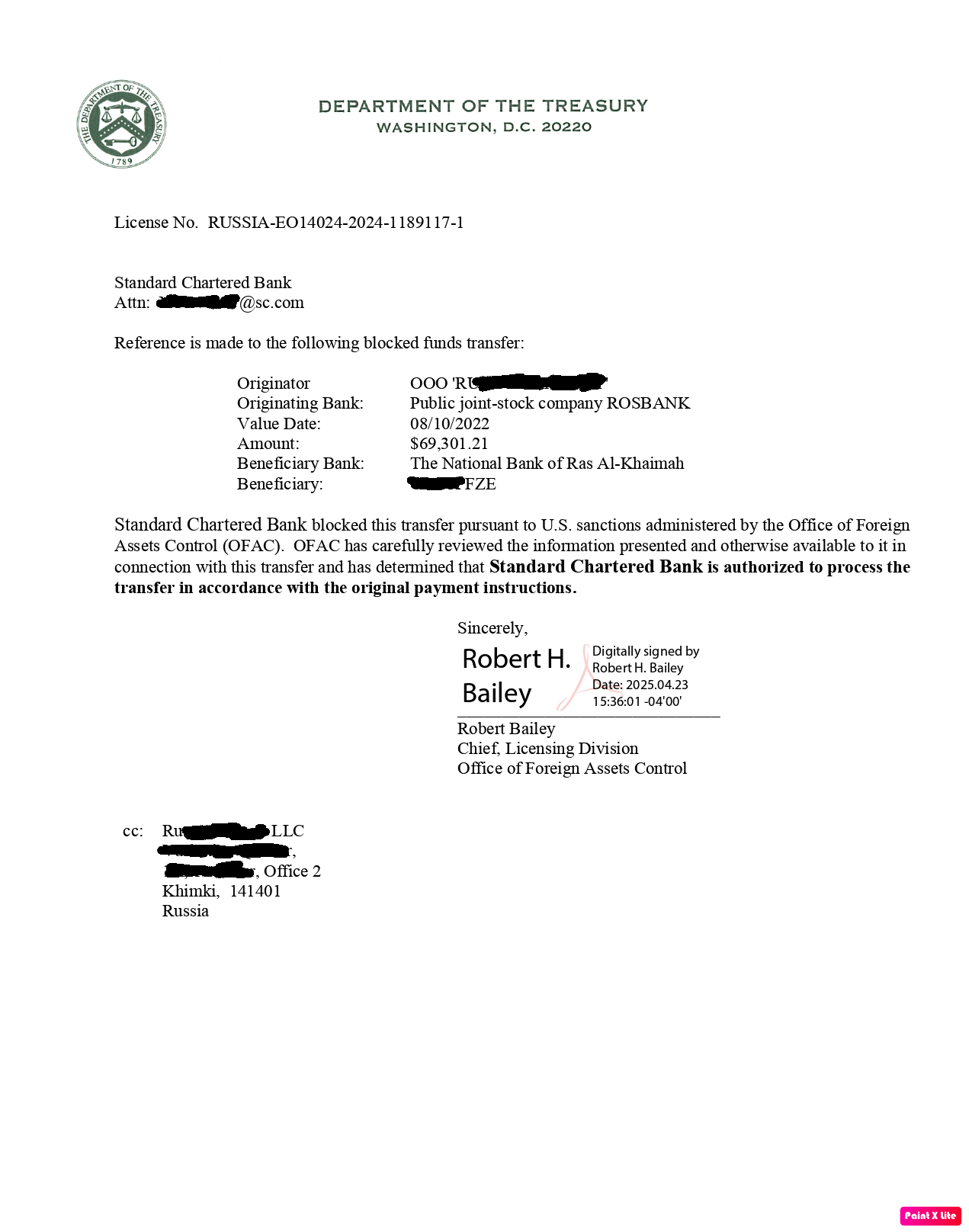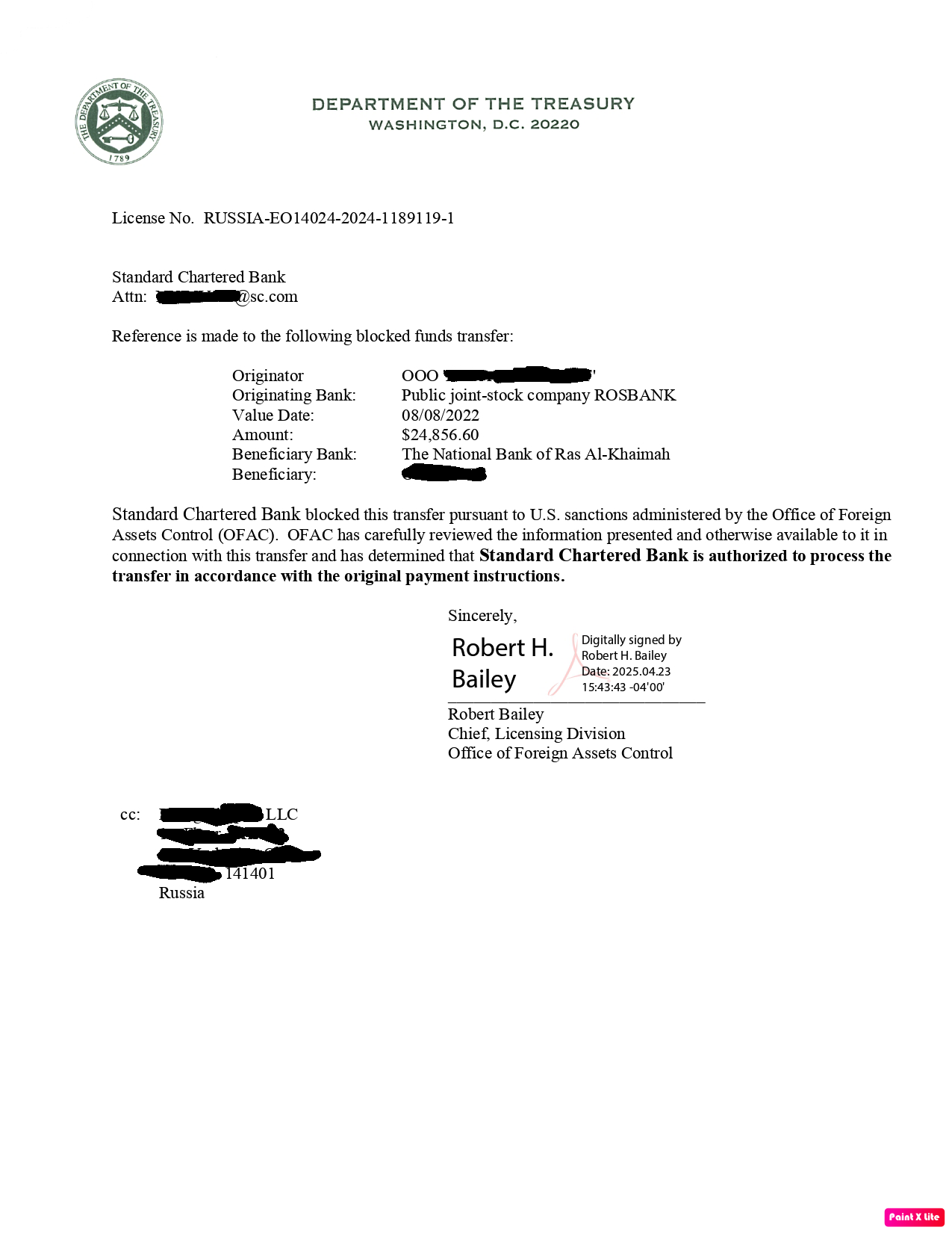 Решение: Получена лицензия OFAC EO14024-2024-1189117