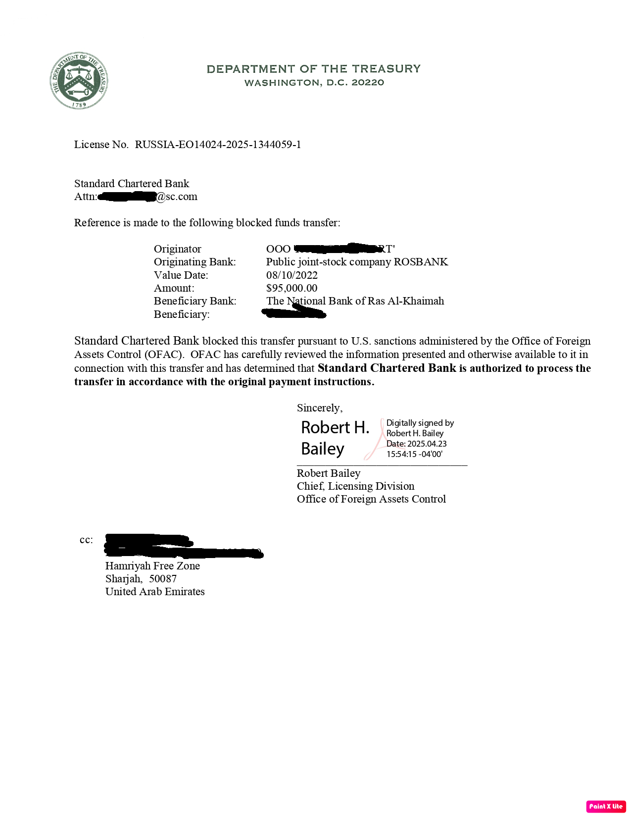 Решение: Получена лицензия OFAC EO14024-2025-1344059